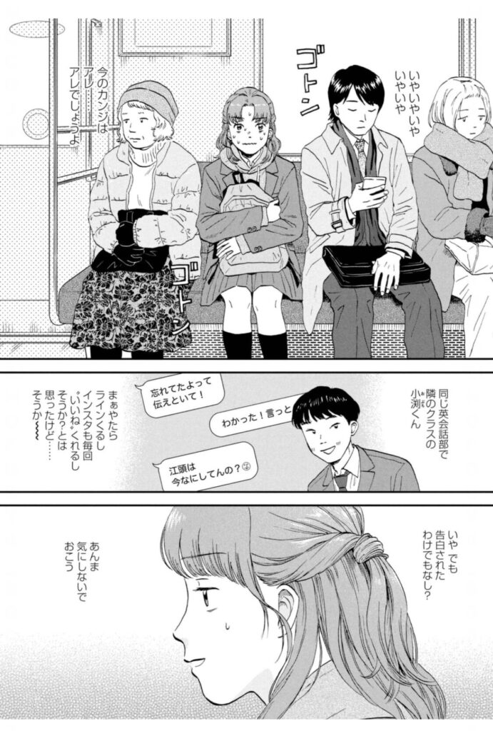 電車のほんわかシーンが良い。普段の通勤時間は高校生のそれとはズレているのだが、たまの早出勤で彼らと乗り合わせると、確かに元気よく雑談している場面をよく目撃する。これは高校生特有、、と書きたかったがよく考えたら私も知り合いと乗り合わせるとついつい周りに聞かれているかを気にせず話していることを思い出した。まあ、好きな人と2人っきりになれる時間なんてそうないのだから、楽しんじゃうよね。